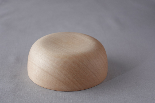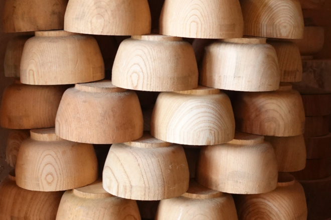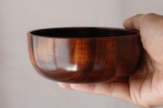 石川県の山中漆器の産地である山中にて、職人さんがろくろで一つ一つ挽いて形をつくっています。