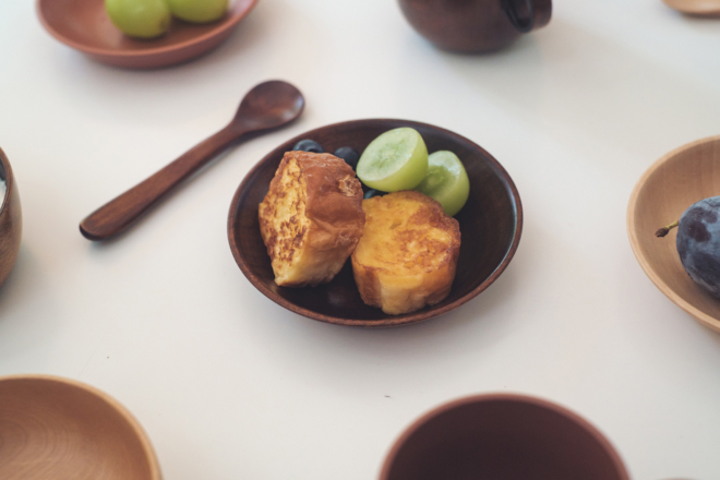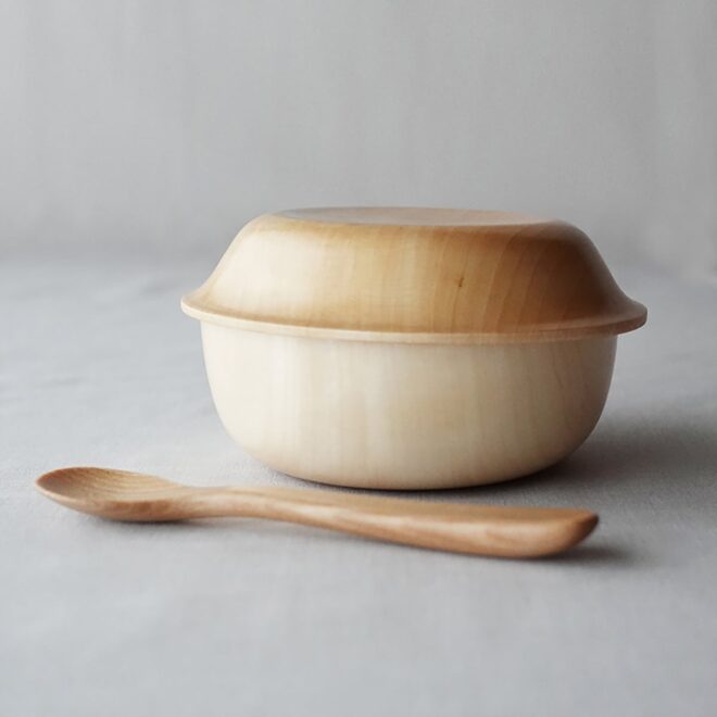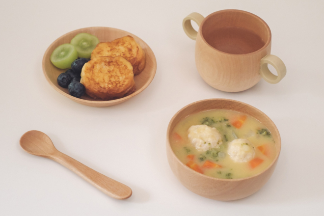 デザイナー自身の経験から、赤ちゃんがお昼寝をしているときに離乳食を準備することが多かったので、PlateはBowlにかぶせることができる形にしました。木の器は昔から「おひつ」等に見られたように、食事を美味しく冷ますことができます。赤ちゃんが寝てる間にも美味しさを保った離乳食を準備することができますよ。